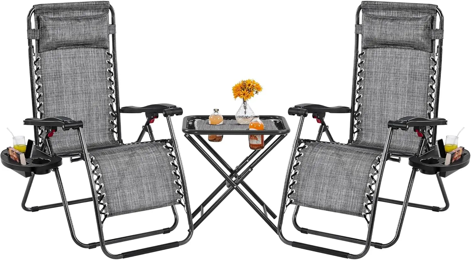 5. Come with Cupholders: Each Each folding recliner is provided with a detachable tray, capable of holding 1 phone, 1 pad, and 2 cups or bottles. The 50 cm L × 50 cm W × 50.5 cm Height side table also comprises 2 cupholders. With this outdoor furniture set, your belongings can be kept easily accessible