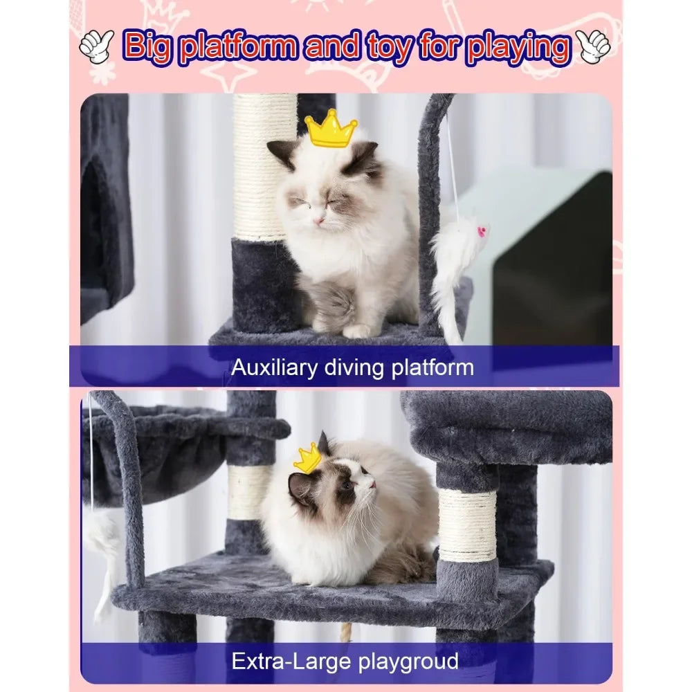 - Unleash nature:Hiding in the cat condo, scratching with sisal posts and rope, climbing via auxiliary platforms, playing with toy ball and cat teaser, Swinging in hammock, kitties can have much fun on this cat tree tower!