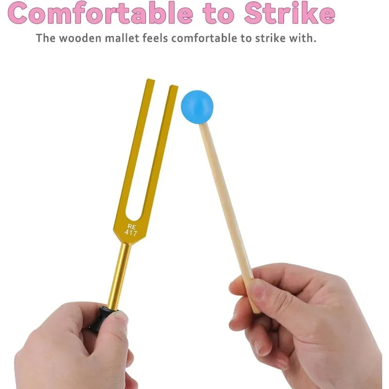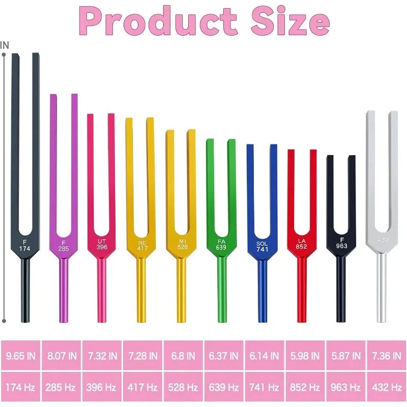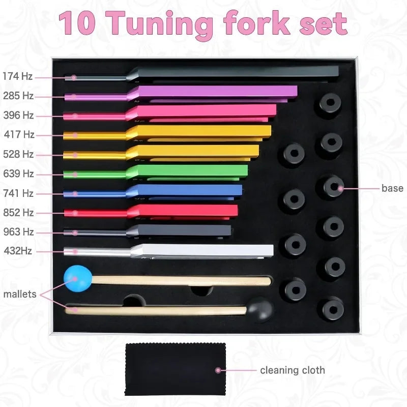 Complete Set:This tuning fork set by includes 10 tuning forks with 174 Hz,285 Hz,396 Hz,417 Hz,528 Hz,639 Hz,741 Hz,852 Hz,963 Hz,432 Hz, 2 mallets, 10 bases, a cleaning cloth, and an exquisite aluminum gift box