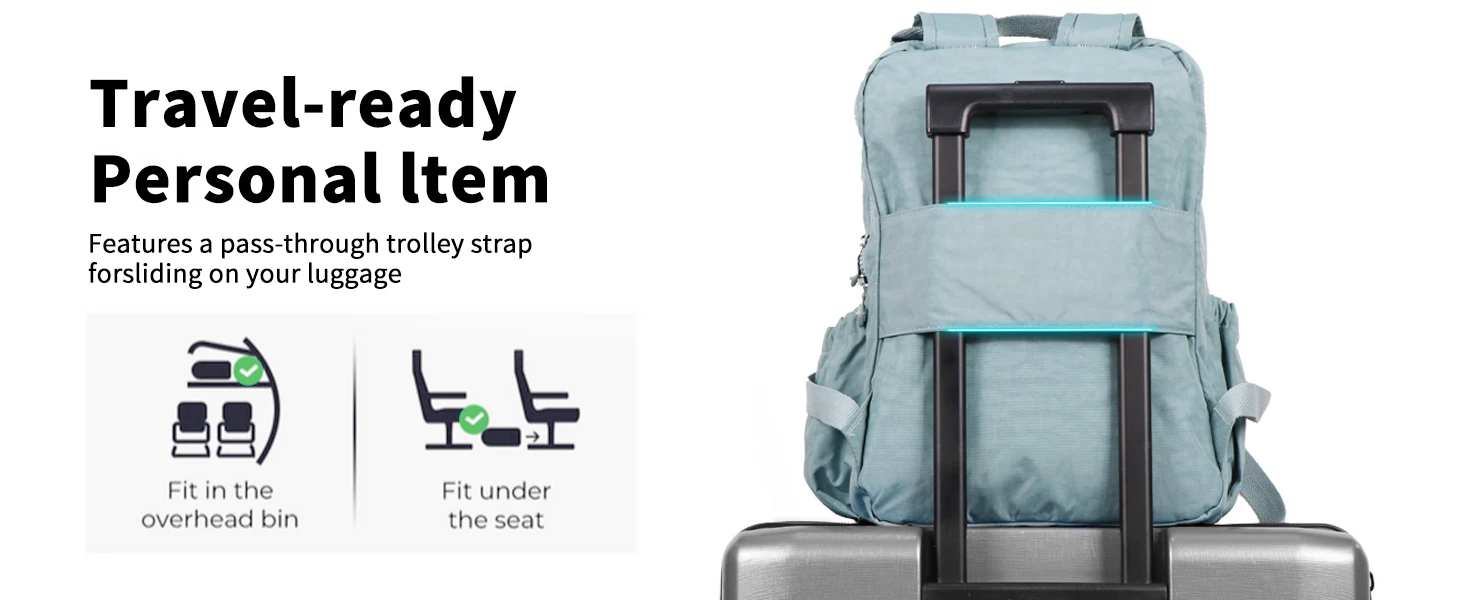 "TSA-approved dimensions (15.7x11.02x6.69") effortlessly fit under airplane seats and in overhead bins, eliminating checked baggage fees."