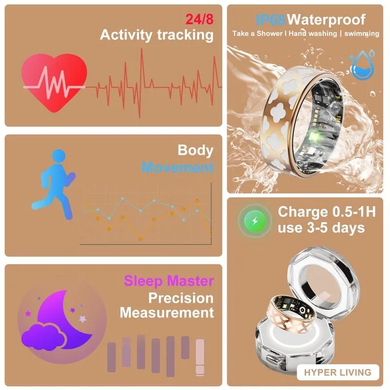 Smart Ring Fitness Tracker with Beautiful Crystal Charging Case, Step, Distance, Calories, Sleep Tracker, Activity Tracker