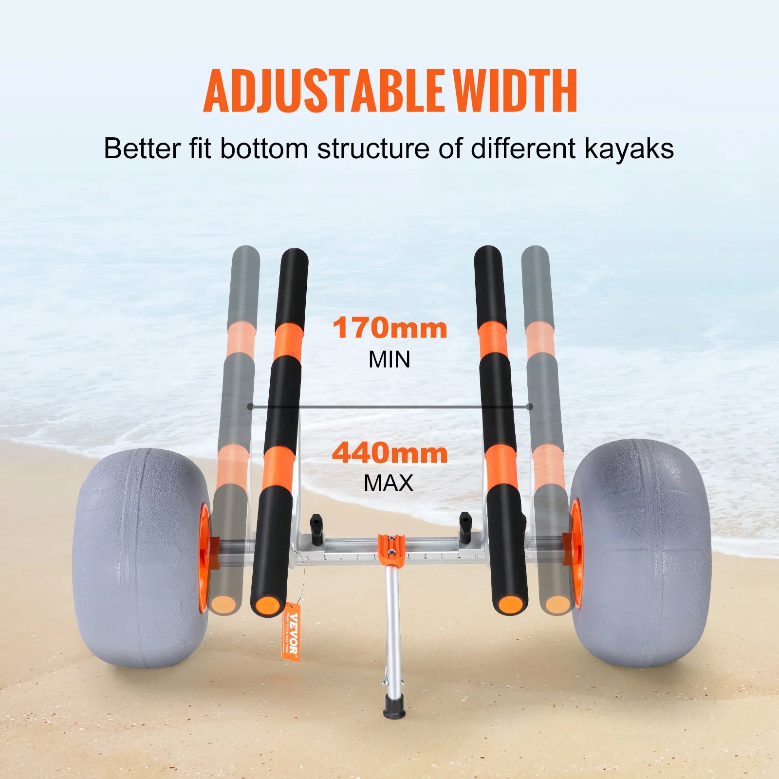Wide Application: The carrying frame of this kayak trailer is adjustable in width at the range of 170-440 mm, making the trailer suitable for more types of kayaks, including canoes, kayaks, Jon boats, paddleboards, floating mats, etc.