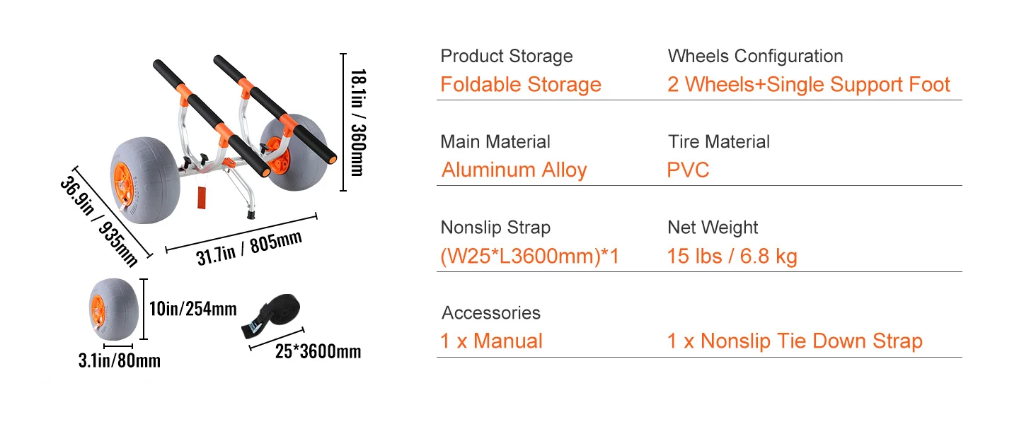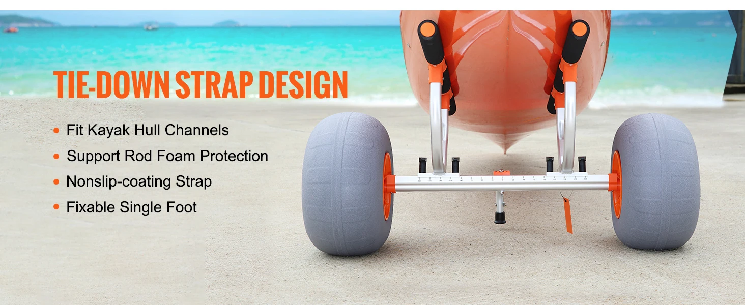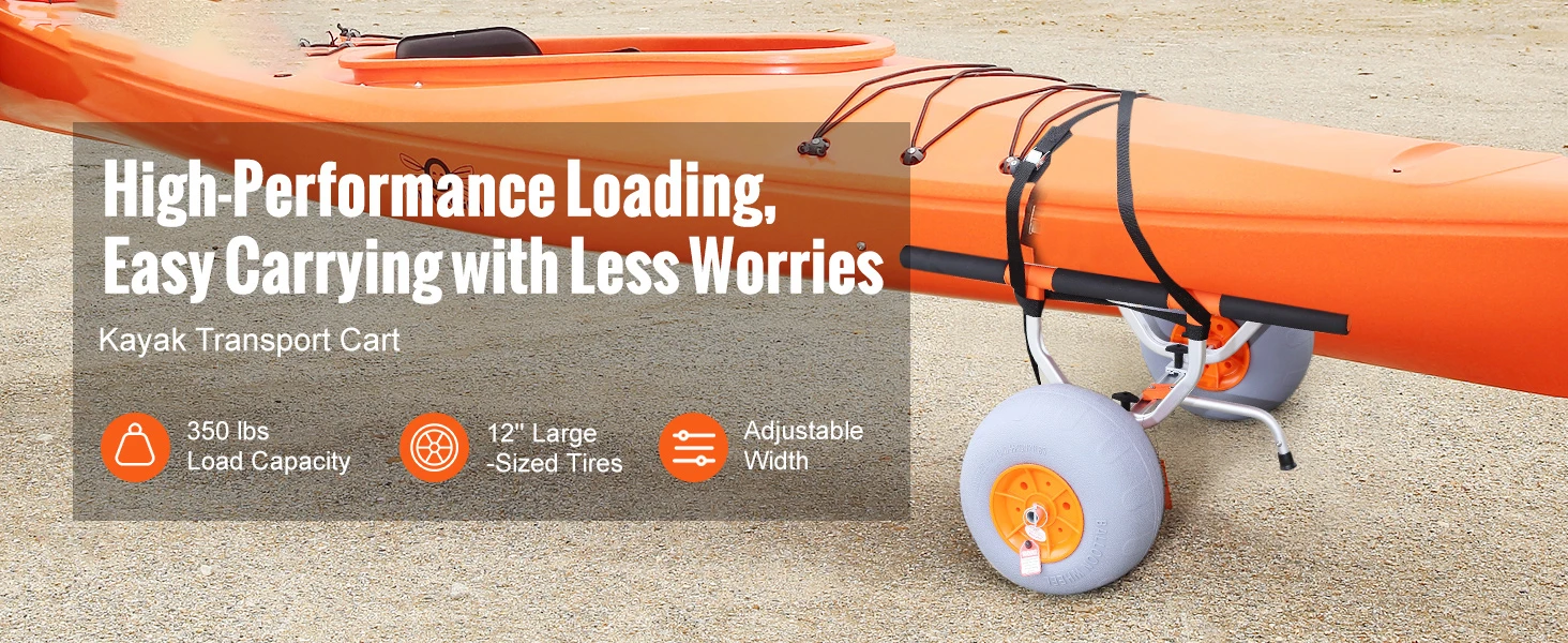 12'' Tires: Our kayak cart is equipped with 12'' rubber tires. The large-sized wheels with the high-efficient bearings can better absorb shock and pass through obstacle sections, making the cart suitable for more terrain, including grasslands, sand beaches, etc.