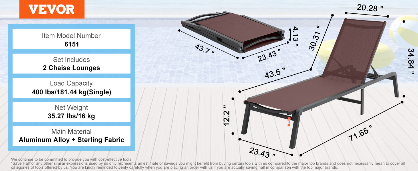 Portable & Easy to Install: The outdoor chaise lounge has a lightweight aluminum frame and a foldable design for easy storage and transport. Unfold and secure the frame to use, taking only 3 minutes to set up. It's convenient and effortless.